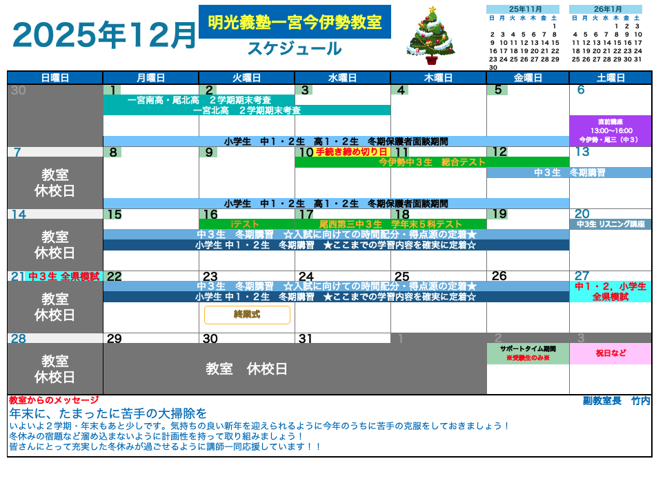 ※12/28(日)〜1/4(日)については冬期休校期間になります。