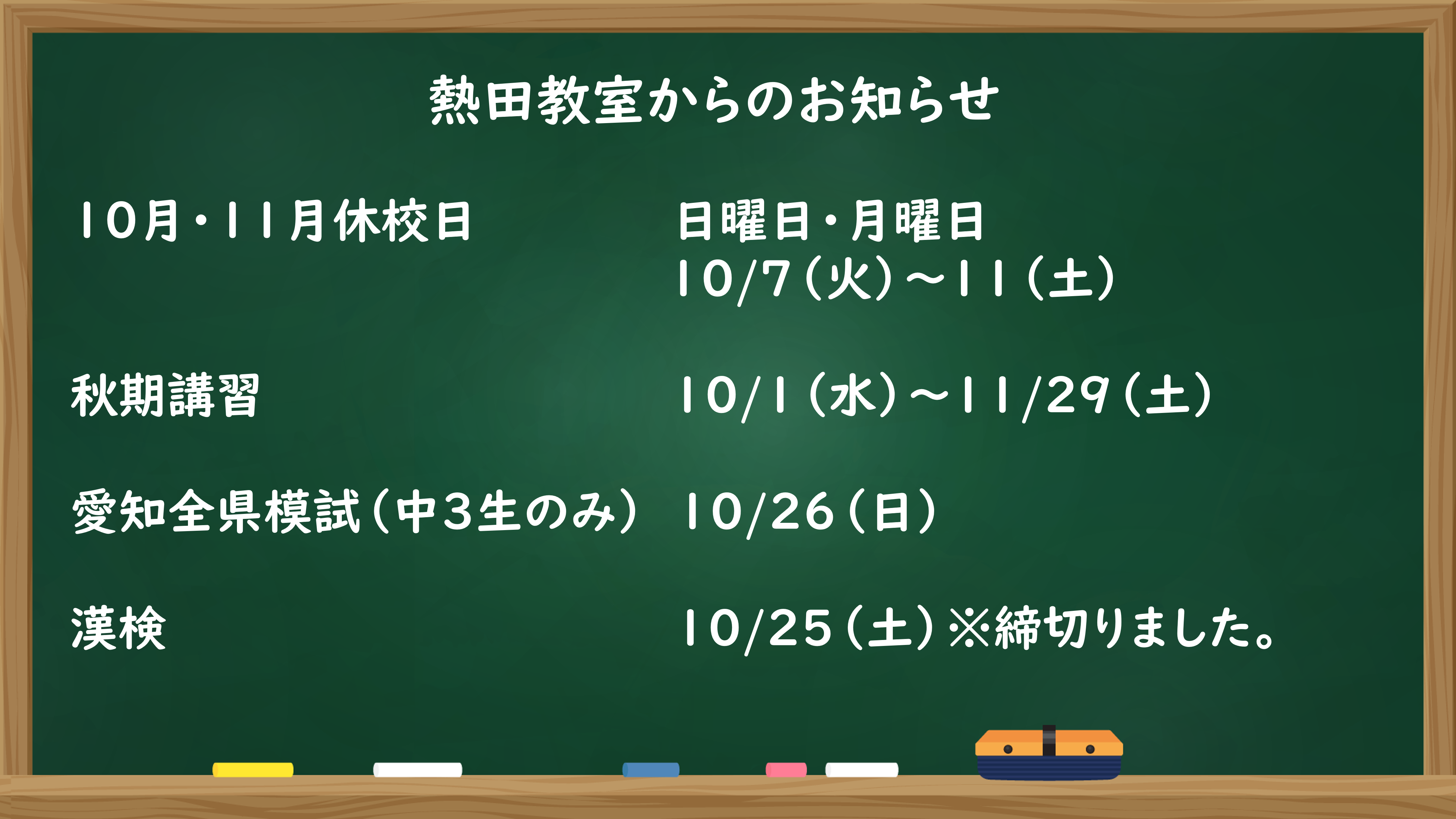中間テストが終わり、合唱コンクールや体育大会など学校の楽しみな行事もあり、毎日が充実されている様子です。そして、想定外に期末テストに追われる日々となる例年でもあります。行事を楽しみつつ、日々の学習のペースを保ち早めに準備しましょう。生活時間や副教科のテスト準備も含めてテスト前の学習方法を今一度見直してみましょう。特に中学3年生は、最後の定期テストとなります。中間テストの反省を生かして、自己ベスト更新できるように既習単元から学校のワーク演習を徐々に進めていきましょう。副教科も含めて内申アップの最後の機会です。悔いのないように取り組みましょう。また、一方で当塾では秋期講習として受験対策をはじめています。5教科のうちの苦手科目でも得点できるように基礎を固めていきます。その他、学習方法がわからない場合や特定の科目で伸び悩んでいる場合は一度塾までご相談ください。