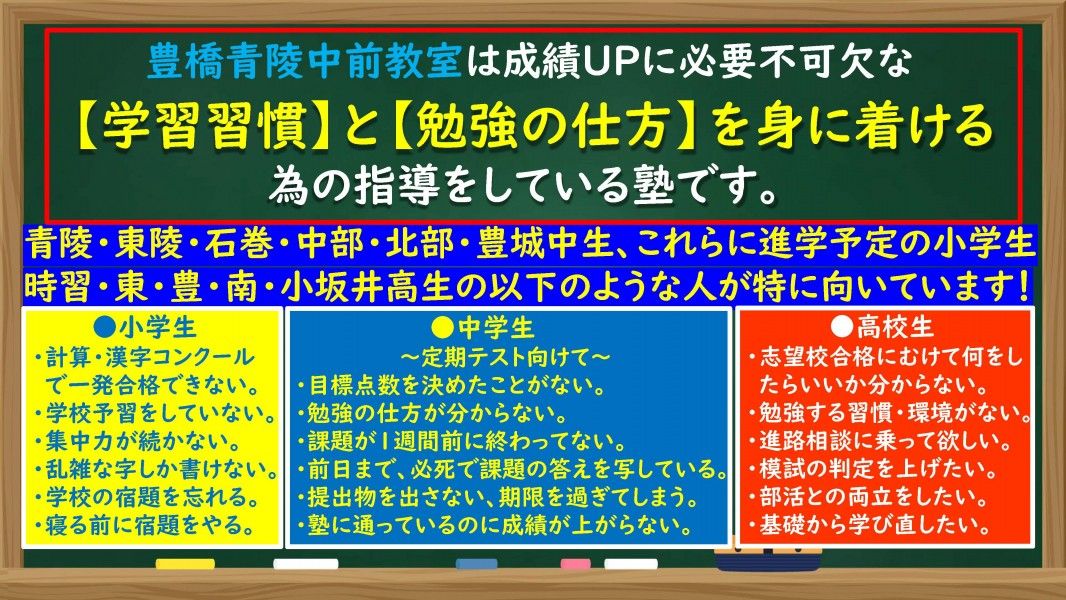 豊橋青陵中前教室、豊橋岩田教室、豊橋北山教室、豊橋東脇教室、新城教室
