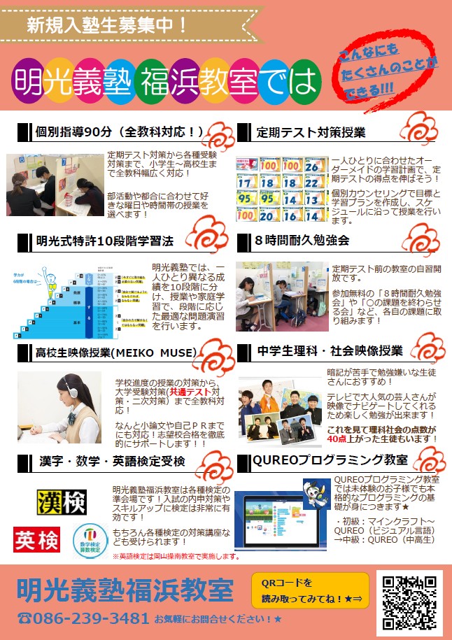 明光義塾福浜教室では、長年のノウハウや情報量が他塾と全く違います。福浜小や芳泉小や平福小や南輝小、福浜中などをはじめとする近隣学校に関する圧倒的な情報量と指導力はどこにも負けません!地域密着型の個別指導で定期テストの点数アップや志望校合格をサポートします。