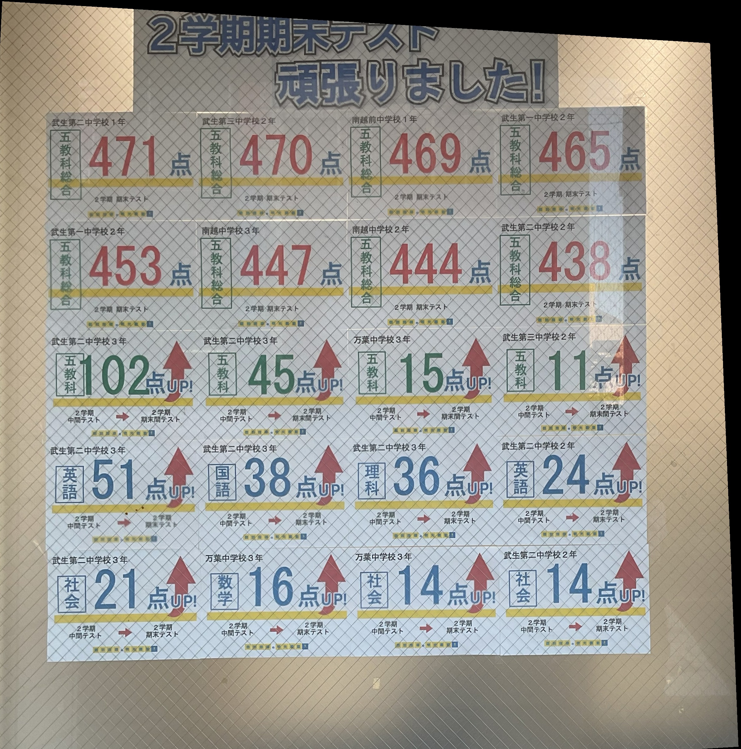 お通いいただく生徒さんには、武生教室での学習を通じて、「自分で考える力」を身につけ、「やればできる」の経験を積んで、「自分にYES」を出せる人になってほしいという想いを持っています。生徒さん一人ひとりの人生の目標があり、その達成のためのひとつとしての成績アップのサポートと考えております。成績アップはもちろん、その先まで全力でサポートさせていただきます。どうぞお気軽に、なんでもご相談くださいませ。