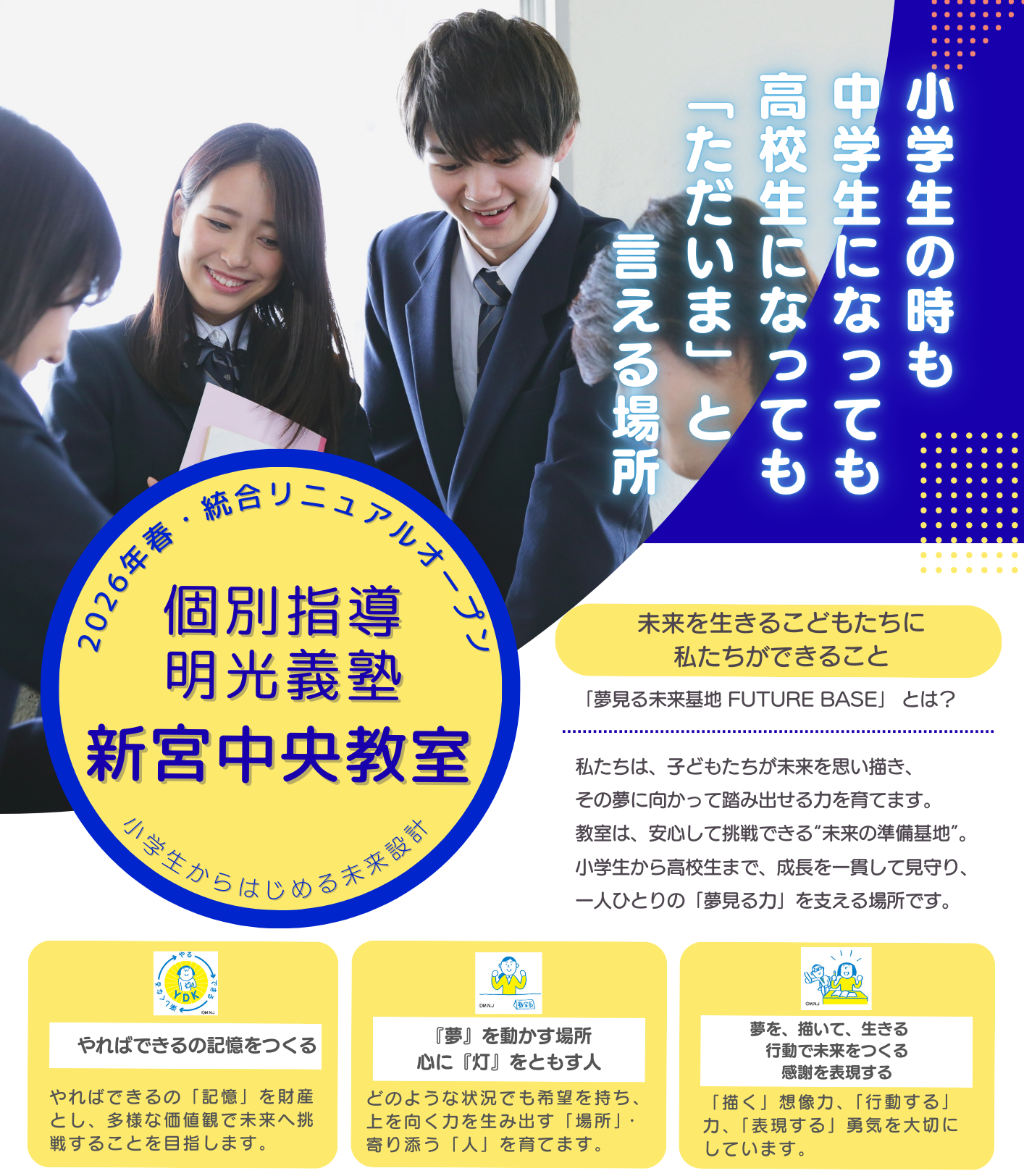 福岡県糟屋郡新宮町 新宮中央駅の目の前にある個別指導塾「明光義塾 新宮中央教室」では、教室を”夢見る未来基地(Future Base)”として子どもたちが未来を思い描き、その夢に向かって踏み出せる力を育てます。
