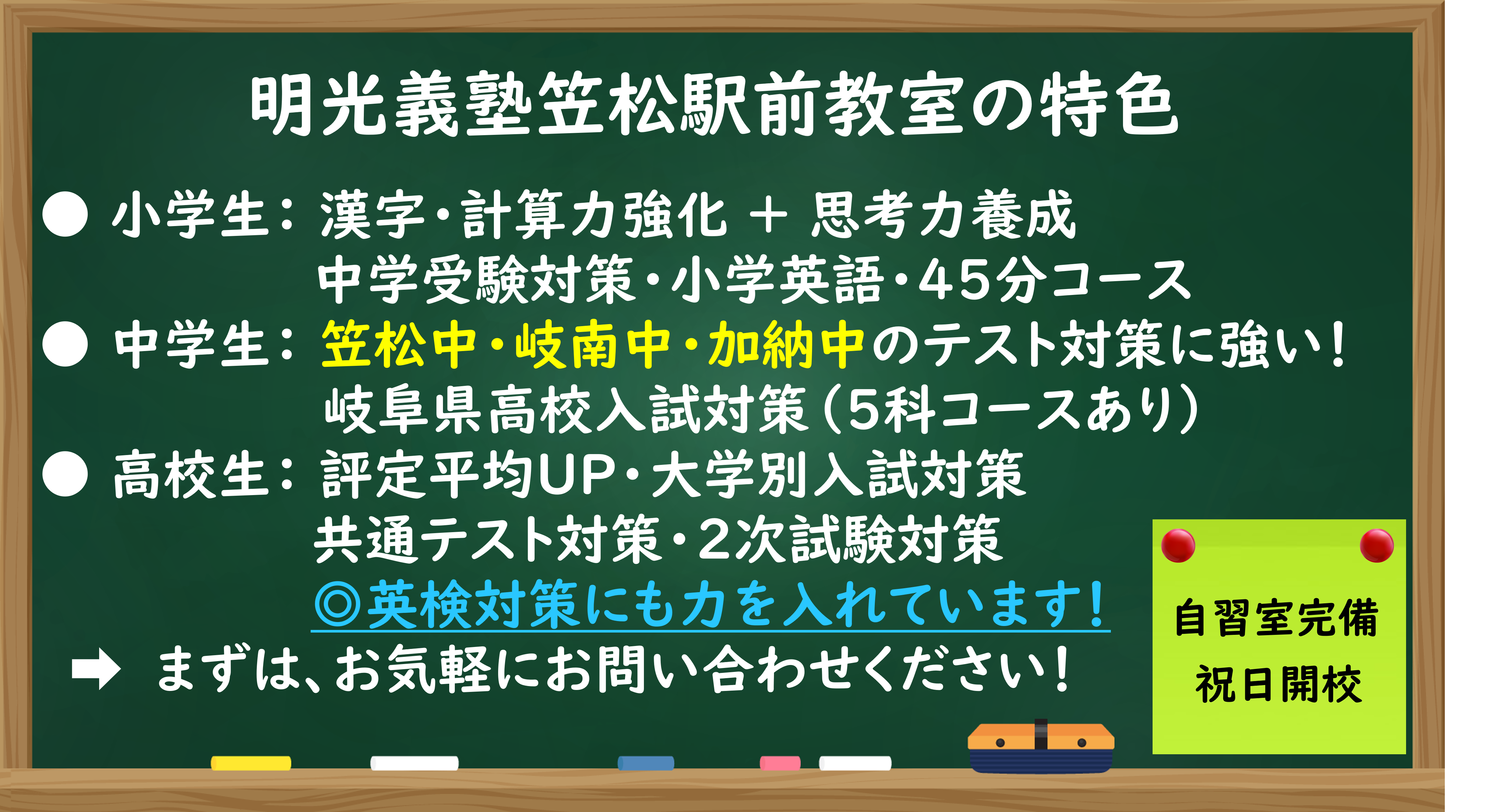 教室長の太田です。笠松駅前教室は開校18年目ですが、教室長歴も20年を超えました。様々な生徒を見てきましたが、子どもは能力、性格、環境、目標、全てが異なるため適切な指導も一律ではありません。適性を見抜き、それぞれに効果的な指導ができるのが明光義塾のいいところです。基礎基本の習得から難関校受験まで勉強や進路にお困りの方はお任せください!