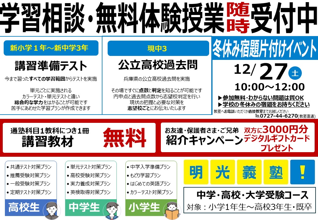 中学生の皆様には、卒業後の進路を見据えた高校選び、志望校のレベル帯に合わせた単元テスト・受験勉強の仕方をお伝えします。