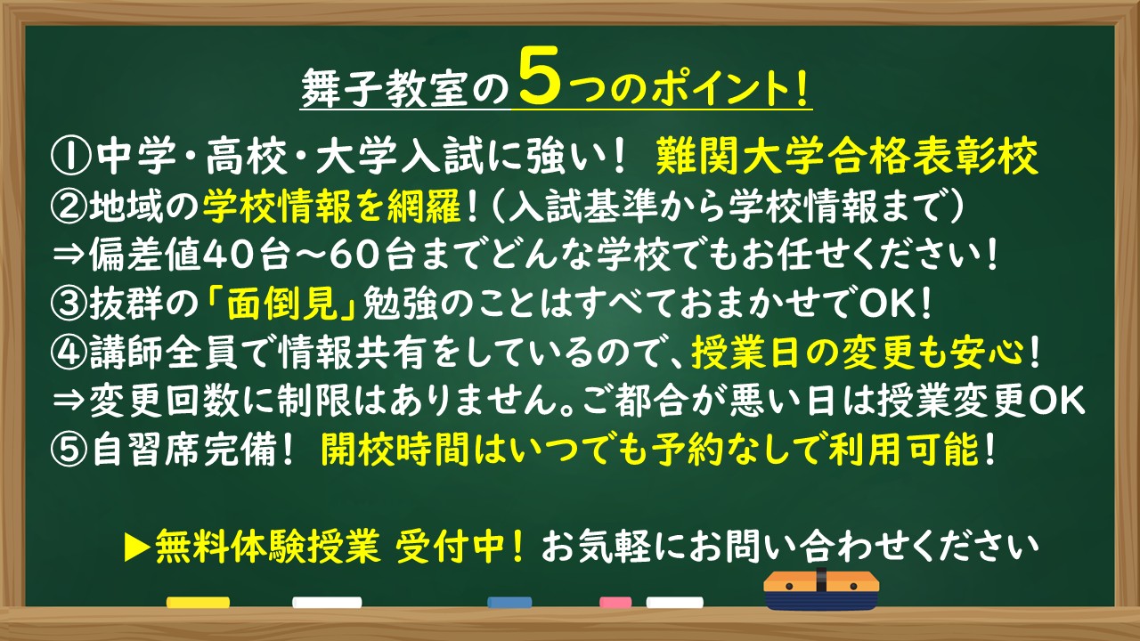 舞子教室では、毎日小学生~高校3年生の生徒さんが元気よく通ってくれています!
