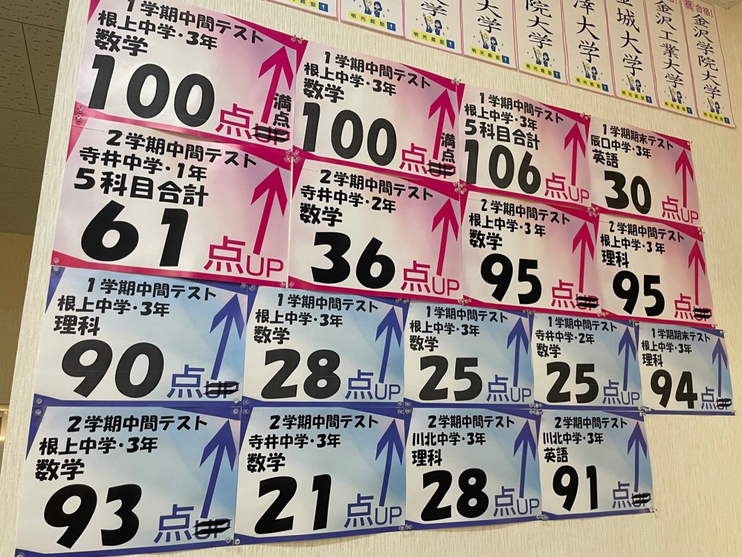 金大付属高校、石川高専、泉丘高校、小松高校、桜丘高校、錦丘高校、金沢西高校、明峰高校、野々市明倫高校、大聖寺高校、小松市立高校、小松工業高校、小松商業高校、寺井高校、星稜高校、金沢高校、金沢龍谷高校、北陸学院高校、遊学館高校、小松大谷高校、他県外高校も多数合格