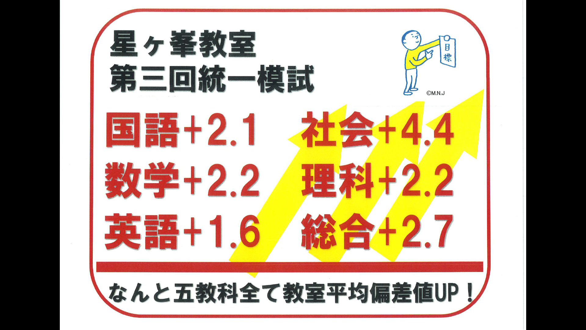 10月も早や下旬。我が星ヶ峯教室生、10月も好調です!8月に引き続き、模試結果は上々でした!なんと五教科すべてで教室平均偏差値がアップしています!全体平均が25点も下がり大きく難化した10月の模試で、偏差値を約5上げた生徒が4名も(詳しくはHP下部「星ヶ峯教室のYDK」をご覧ください)! 第一志望校も高い判定をキープ!生徒の皆さんはよく頑張ってくれました。このように、星ヶ峯教室では結果にこだわって指導しています。必ずや成績を上げてみせます!