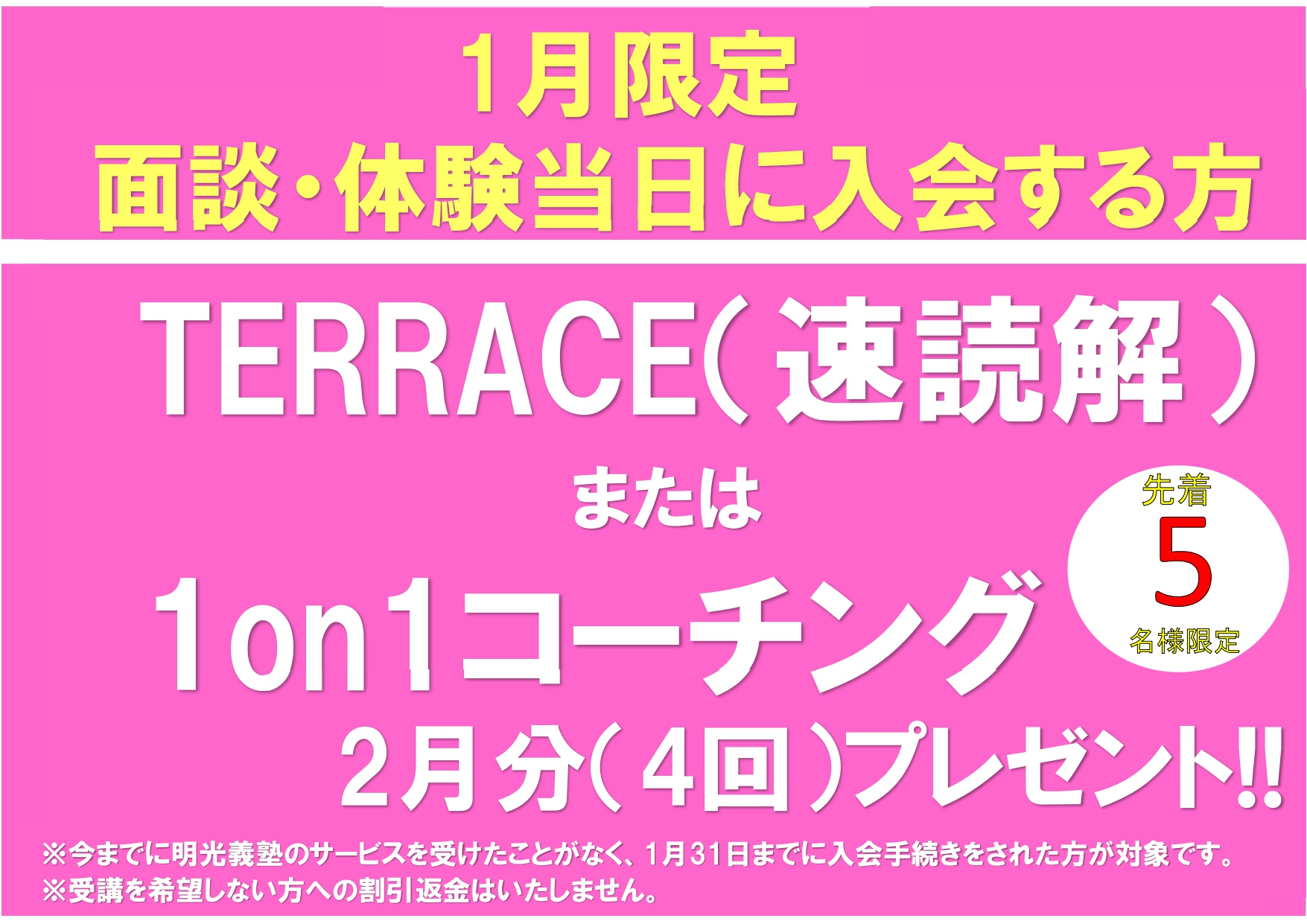 面談・体験当日に入会する方 TERRACE(速読解)または1on1コーチング 2月分4回をプレゼント