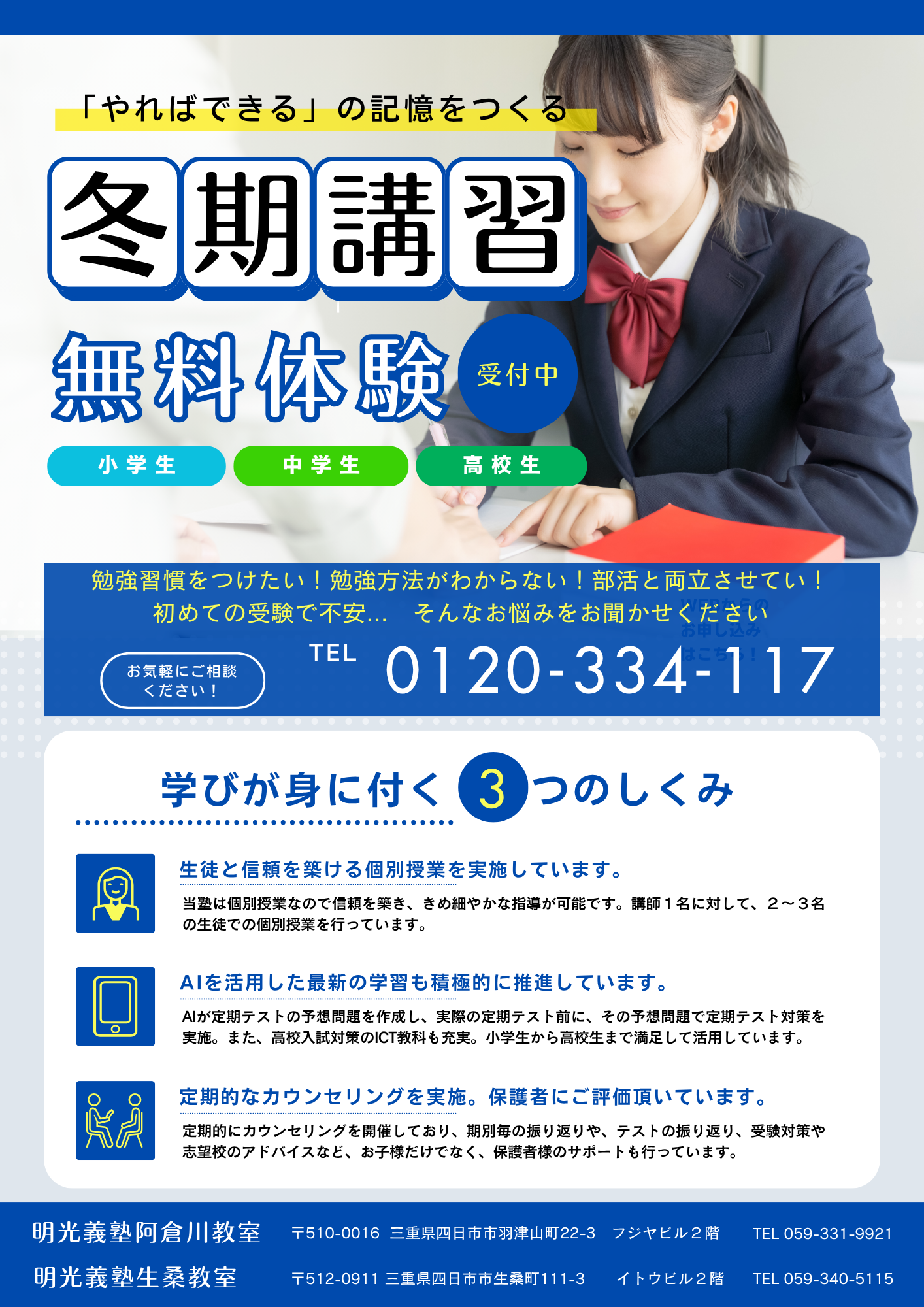 四日市で、学校の成績UP、テスト対策、入試対策の個別指導塾をお探しの方は、是非一度お問い合わせください!