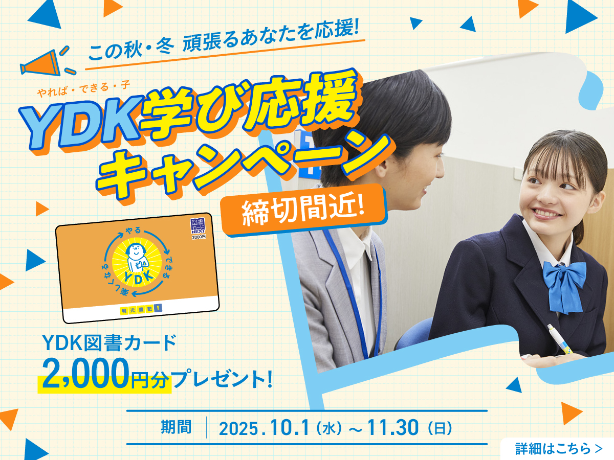 この秋·冬 頑張るあなたを応援!YDK(やれば·できる·子)学び応援キャンペーン YDK図書カード2,000円分プレゼント! 期間:2025.10.1(水)~11.30(日) この秋·冬 頑張るあなたを応援!YDK(やれば·できる·子)学び応援キャンペーン YDK図書カード2,000円分プレゼント! 期間:2025.10.1(水)~11.30(日)