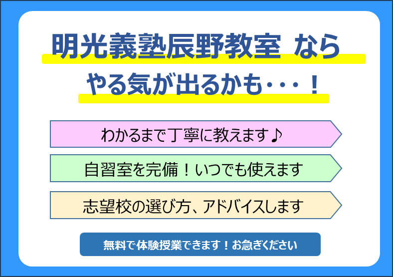 こんにちは!明光義塾辰野教室です!辰野中では今年からテスト回数が変わり、今回のテストから範囲が膨大となりました。