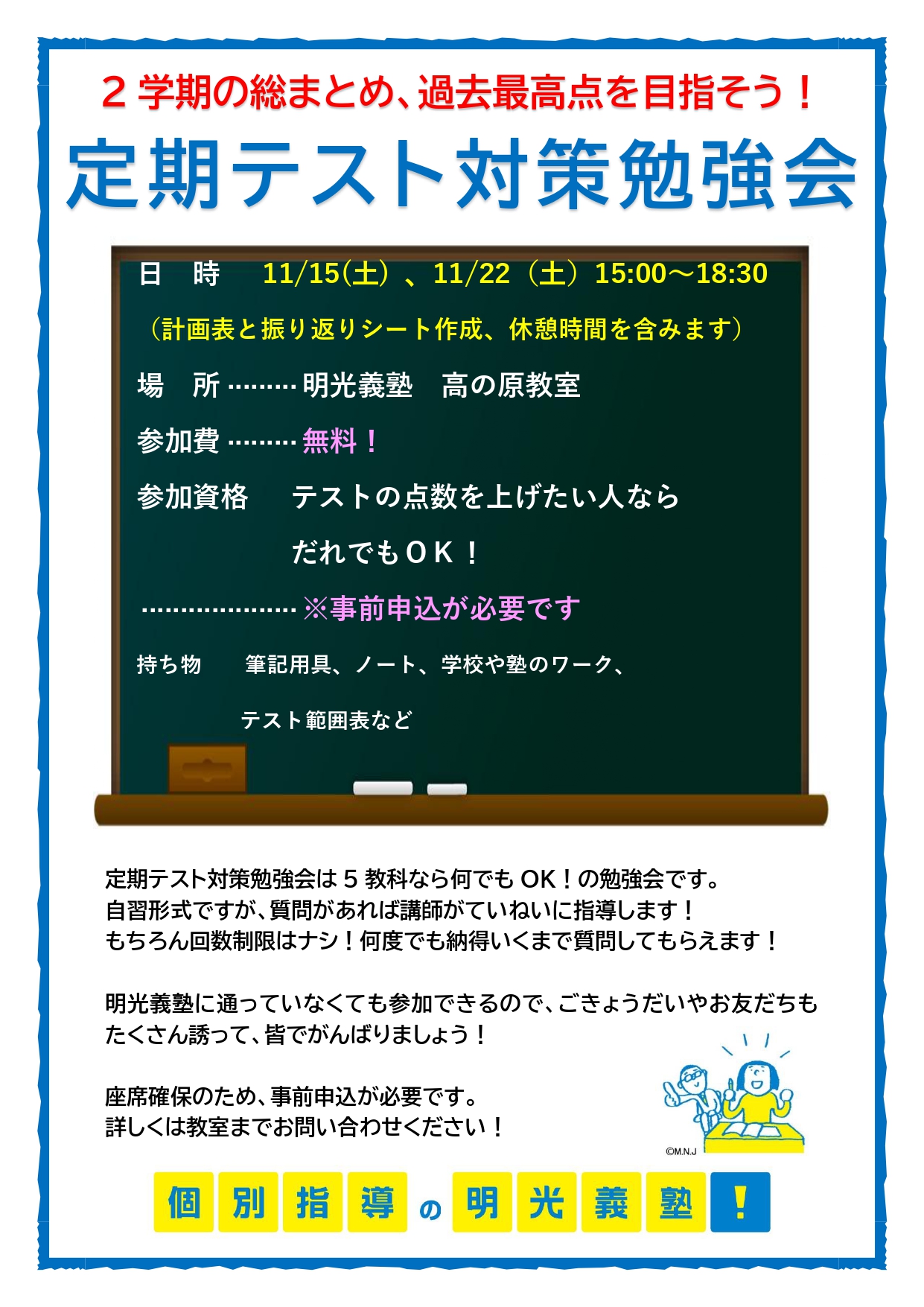 当塾では、通常授業に加え、定期テスト対策授業と勉強会で