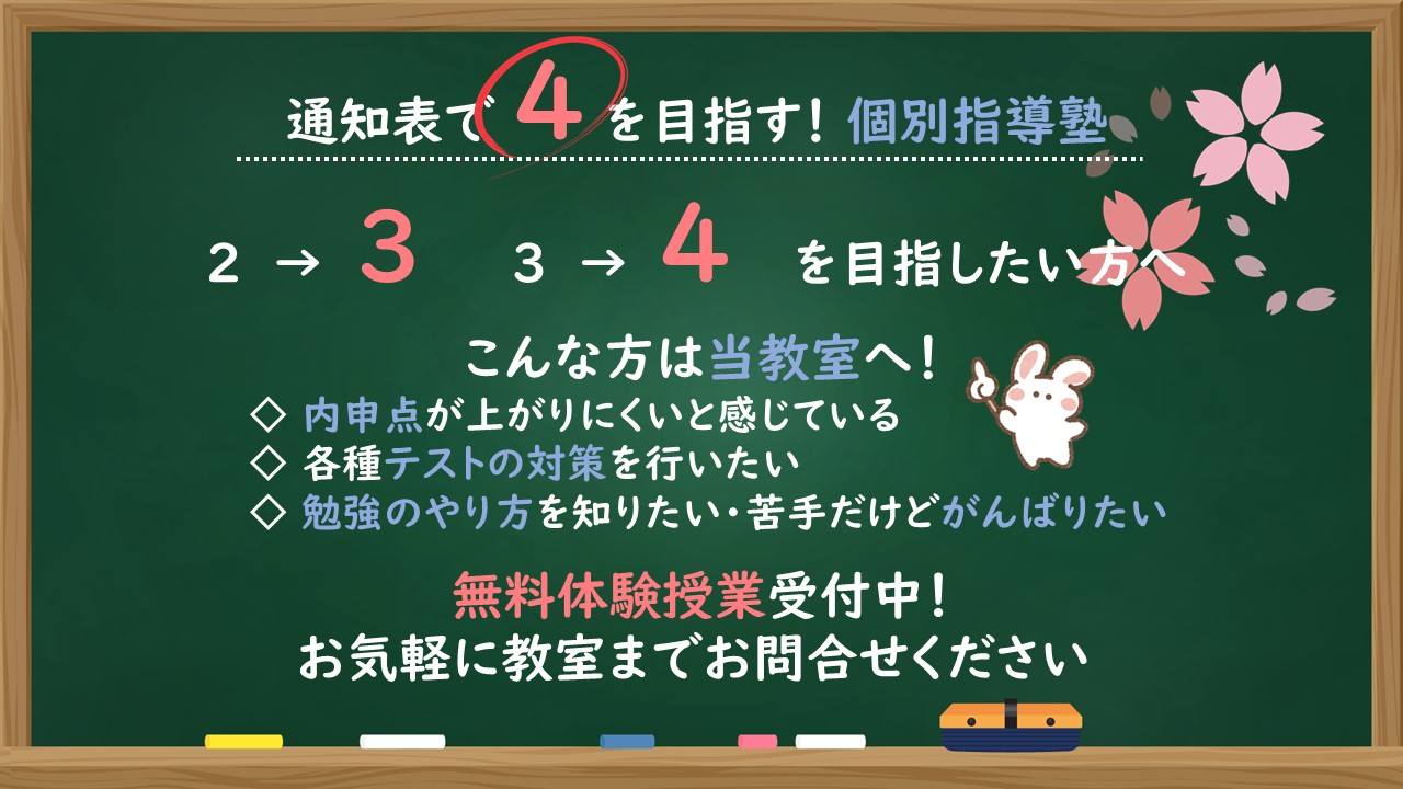 「通知表で2→3、3→4を目指す個別指導」の学習塾です。