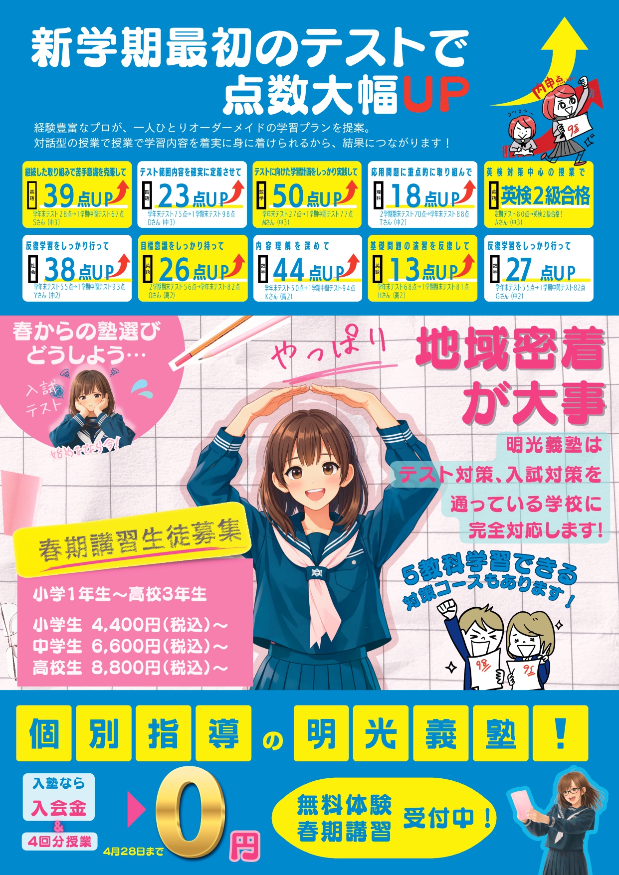 中学校による難易度差と特徴があります。個別指導と対策授業を組み合わせて、自分史上最高点を目指しましょう