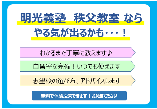 明光義塾秩父教室では、ベテラン講師が揃っていますので、苦手対策、受験対策は多くの経験をもとに指導しますので安心です。