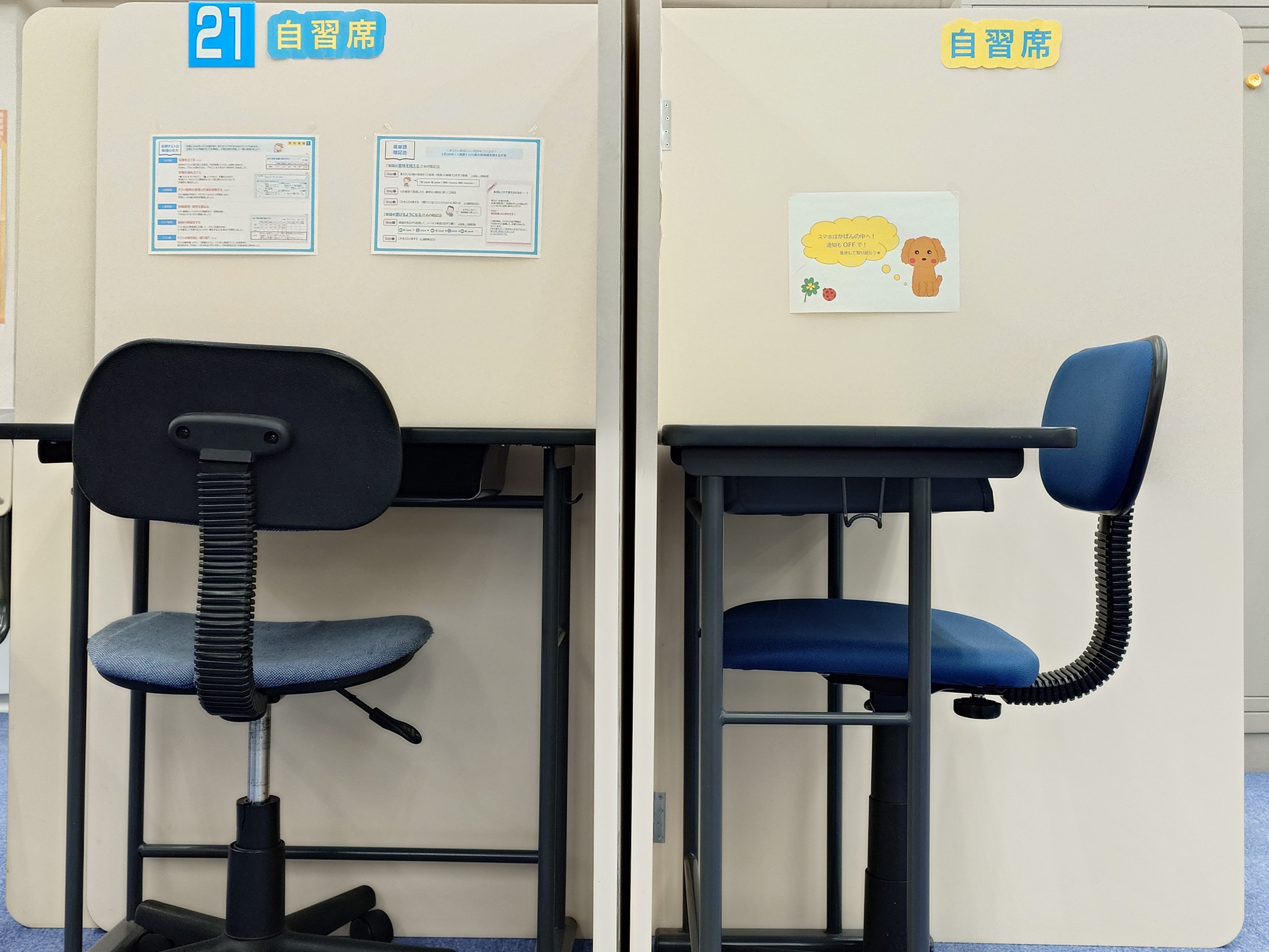 机の配置を変更して、教室がリニューアル!広々とした空間で勉強ができます。自習する席もございます。
