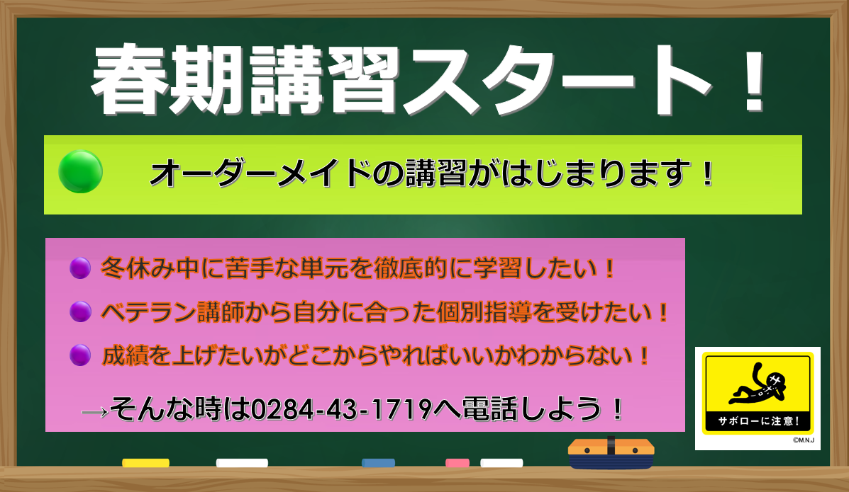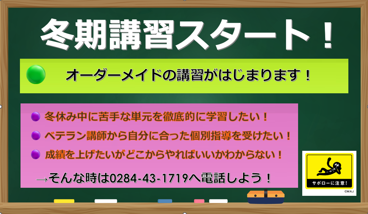 お問合せは直接教室にご連絡下さい。0284-43-1719(平日2時~10時)