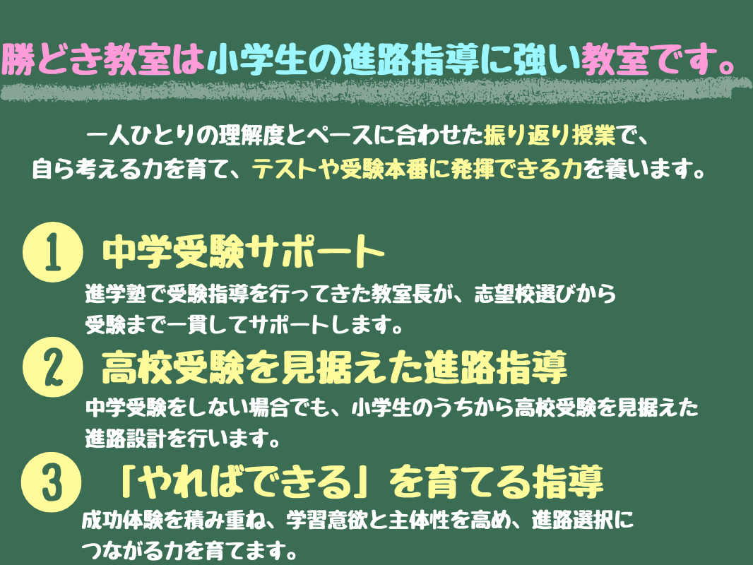 「集団塾のカリキュラムが合わない」「途中から受験に切り替えたい」などの状況に対応します。