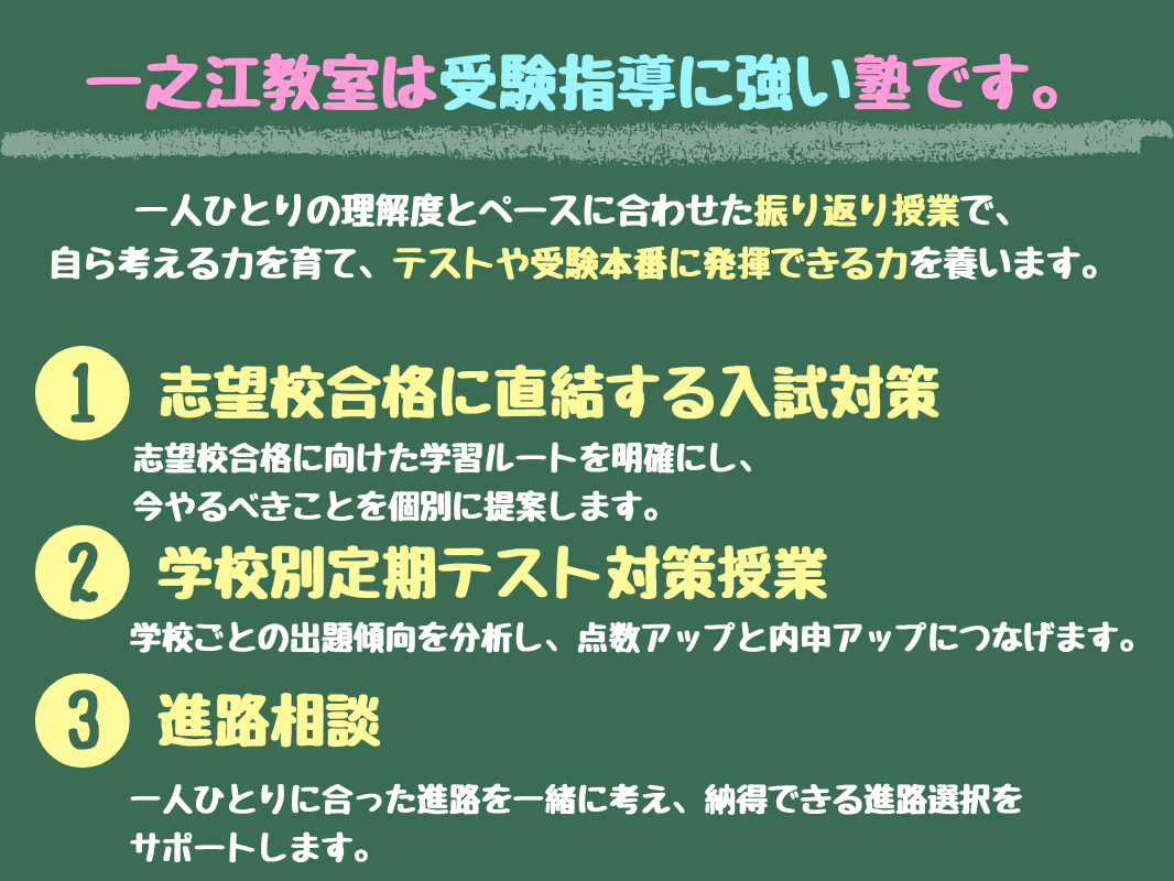 当教室では、《学校のテストの点数》はもちろん《通知表》《模試の結果》など、《志望校合格》を常に視野に入れて指導をしています。