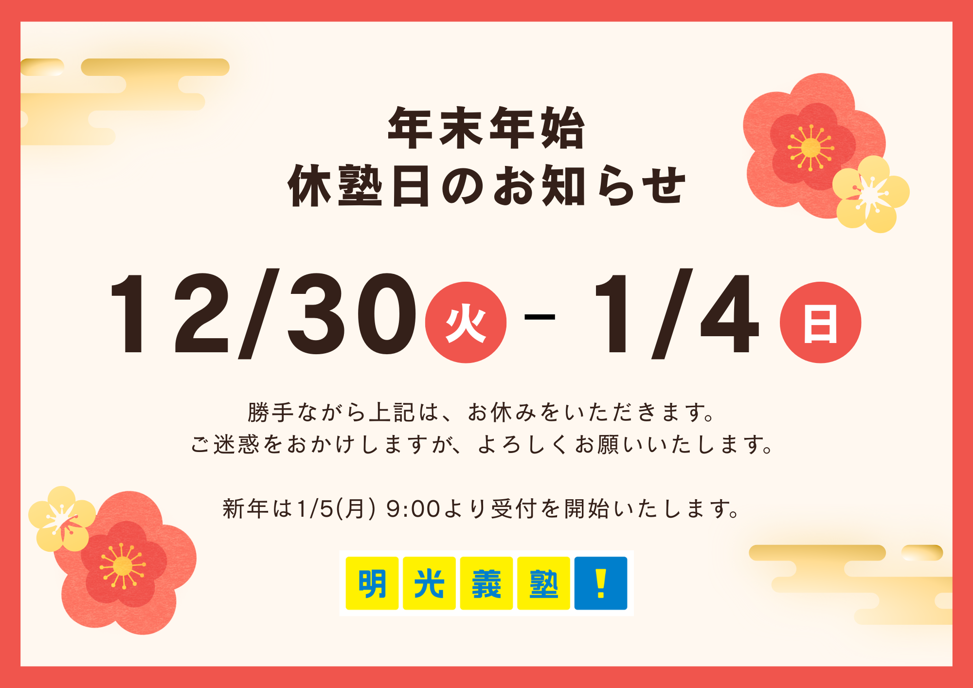 ※日曜日は休塾日です。12/30(火)~1/4(日)は休塾日です。