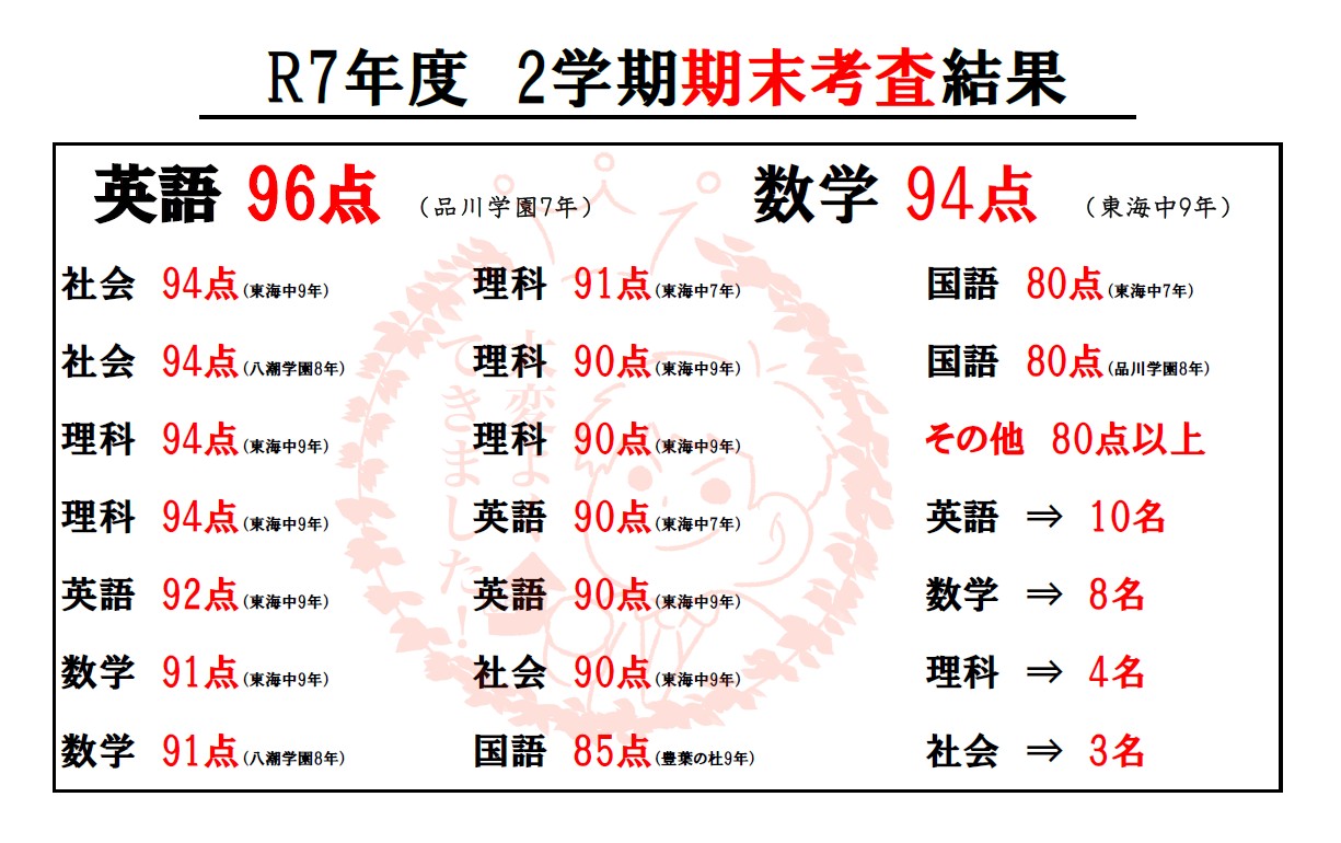 中学生の指導実績に加え、小学生指導にも自信があります。ぜひ早い段階から安心してお任せください。