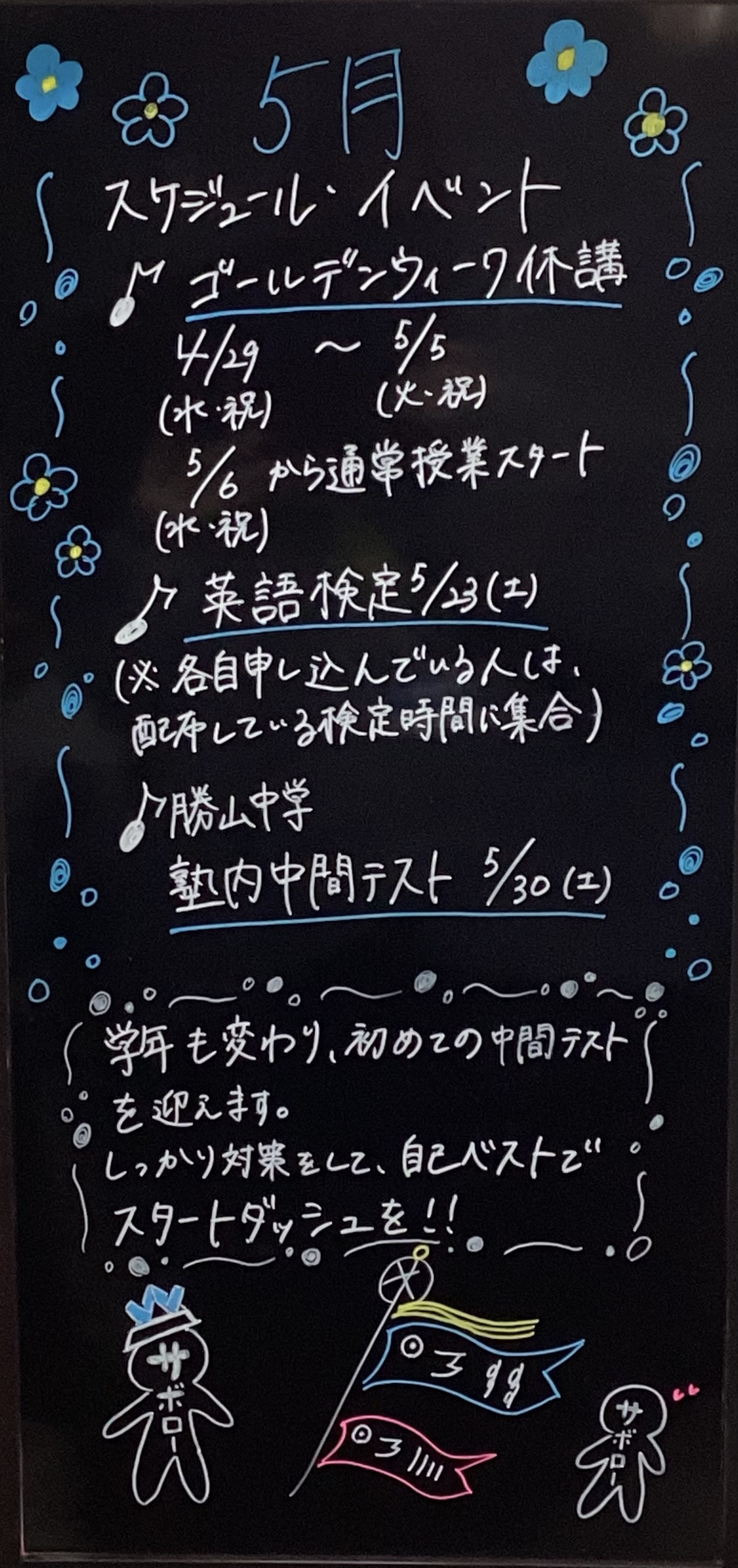 GW休講(4/29祝から5/5祝まで)5/6祝から開校となります。