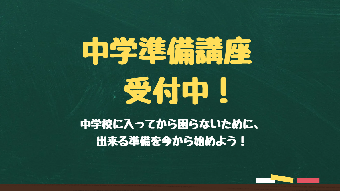 4月から中学校へ入学される生徒様対象に中学準備講座を開講します。「中学校の授業についていけるだろうか」、「定期テストは大丈夫だろうか」など中学校入学前の不安を少しでも解消してから4月を迎えるべく、余裕を持った準備をしていきましょう。中学準備講座では、分数・割合などの小学校の重要単元をしっかり復習し、中学内容の先取りまで行います。予習をしておくことで、自信を持って中学校の授業を受けることが出来ます。